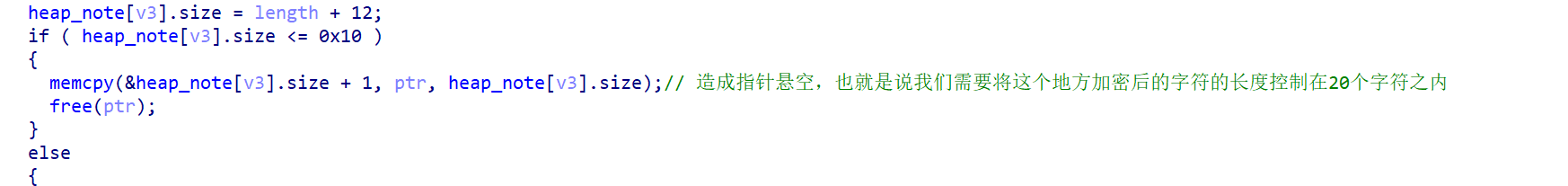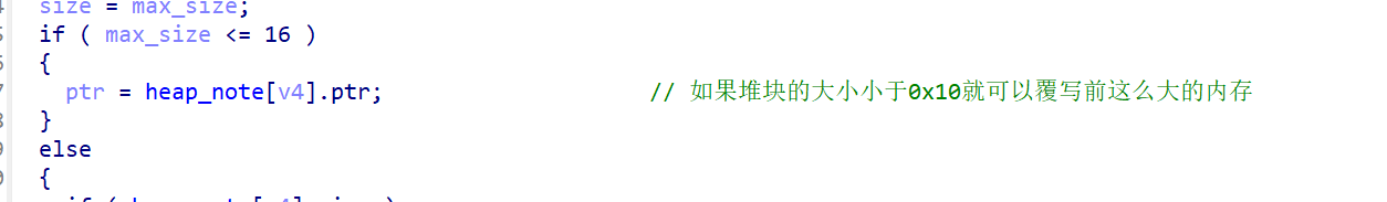 (1)任意写0x10大小内容到堆块中:upload函数中,当申请堆块的大小小于0x10的时候就会将直接将指针给ptr而不是重新申请