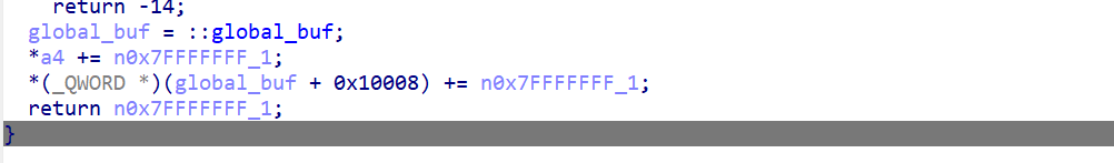 实现向一块 64KB 缓冲区写数据。这里的缓冲区位置有用户设置,但是注意到这里能够实现对global_buf + 0x10008)这里存储的数值的增大,最终相当于实现了global_buf大小虚拟扩大