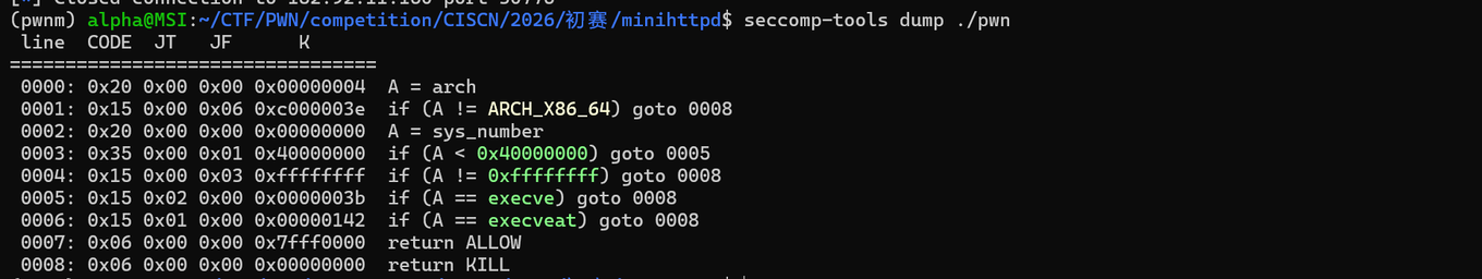 Web_pwn,逆向一下,程序开了沙箱,禁用execve和execveat