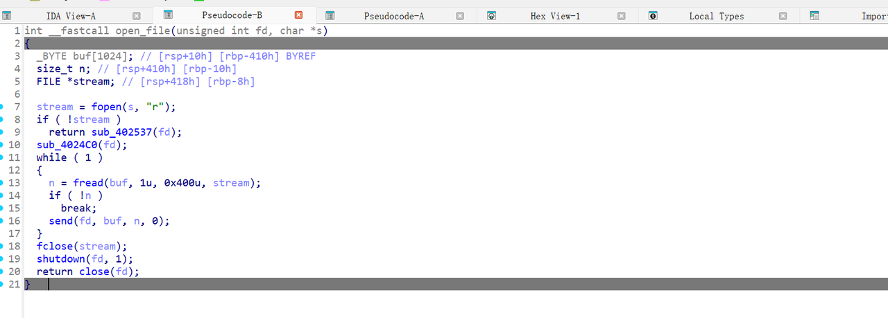利用溢出,构造rop来将flag文件打开来发送给用户就好,我们先栈溢出一次利用recv写入/flag字符串和后续rop链,之后利用recv后面leave ret跳栈,控制执行流到我们刚刚写入的rop链子上,也就是我们的open_file函数上,注意,由于程序中会调用snprintf,为了防止这个函数不断抬栈到一个不可写的地址,我们需要设置rbp尽可能地低。vmmap发现heap紧挨着程序地地址,所以相当于我们知道heap地址,直接将rbp覆盖为heap地址就好。脚本如下:
