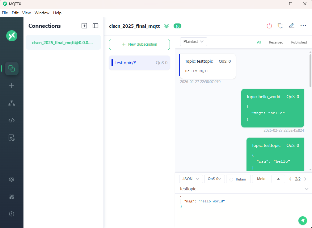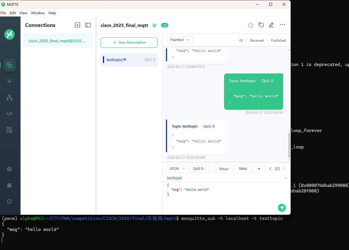 mosquitto_pub -h localhost -t testtopic -m "Hello MQTT"可以看到在客户端已经收到了消息