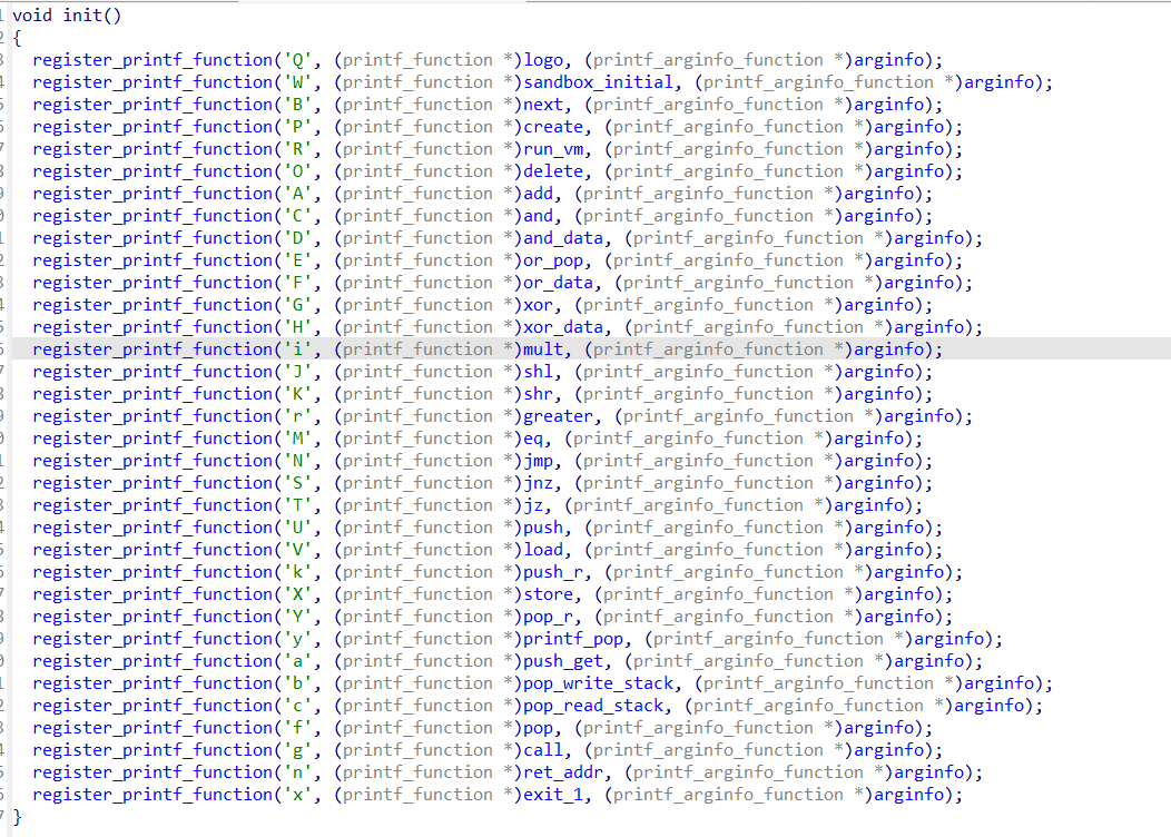 这道题算是RE中的“printf虚拟机”。这种VM的特点是使用register_printf_function函数,注册一些函数,用来解析某些特定的格式化字符串