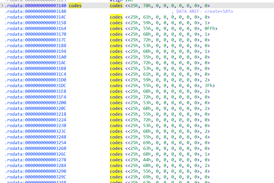 其中虚拟机指令片段在.rodata段0x3140处: