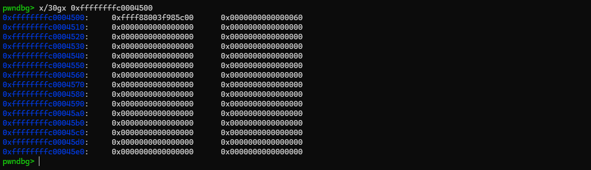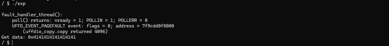 结合前面创建并启用的 userfaultfd,可以将这一过程理解为:我们人为地准备了一段“必然会触发 page fault 的内存区域”,并且将其缺页异常的处理权交由用户态控制。在后续代码中,当有线程访问该地址时,内核会暂停该线程并通过 userfaultfd 通知用户态,从而为后续精确控制执行时序(例如构造 race condition 或 UAF 利用窗口)提供基础条件。